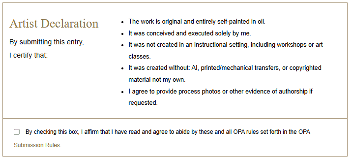 While these updates can feel tedious, they serve an important purpose: protecting artists who work honestly and ensuring a level playing field for everyone. OPA’s mission remains unchanged—to uphold excellence in representational oil painting