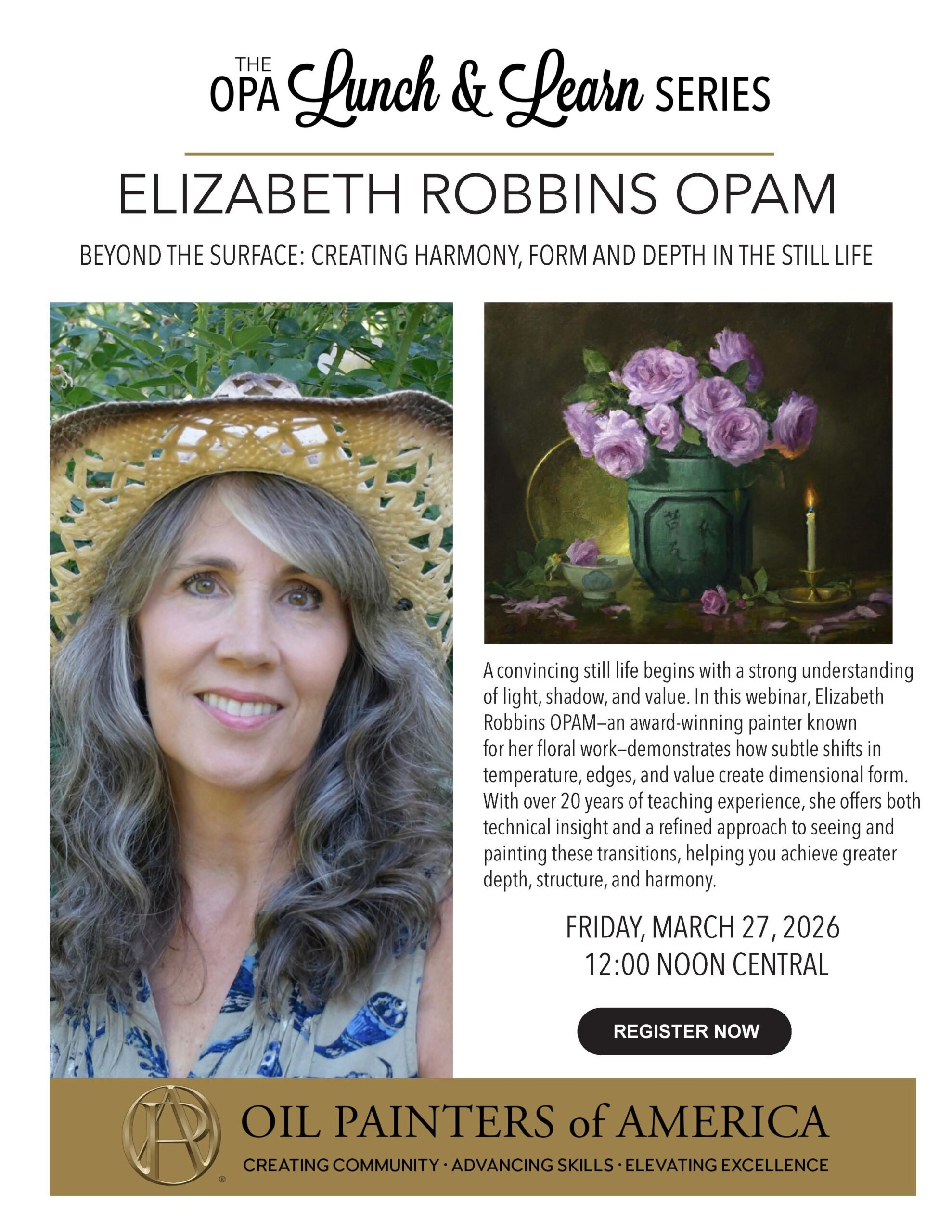 Join Elizabeth Robbins OPAM for a special Lunch and Learn Beyond the Surface: Creating Harmony, Form and Depth in the Still Life
